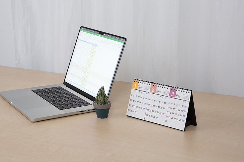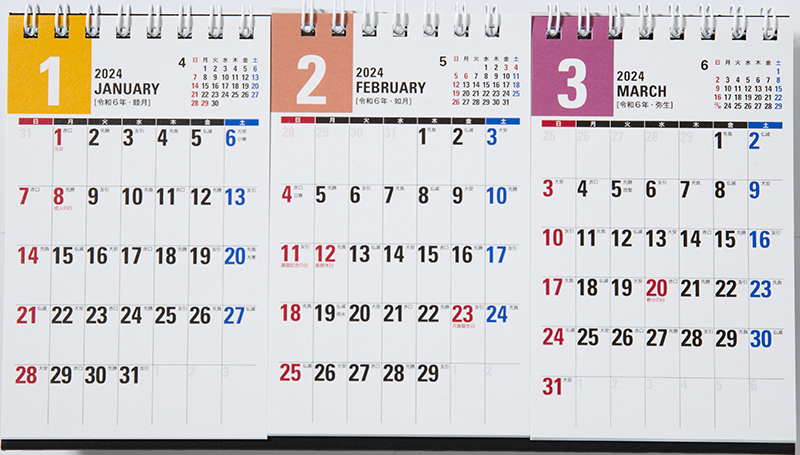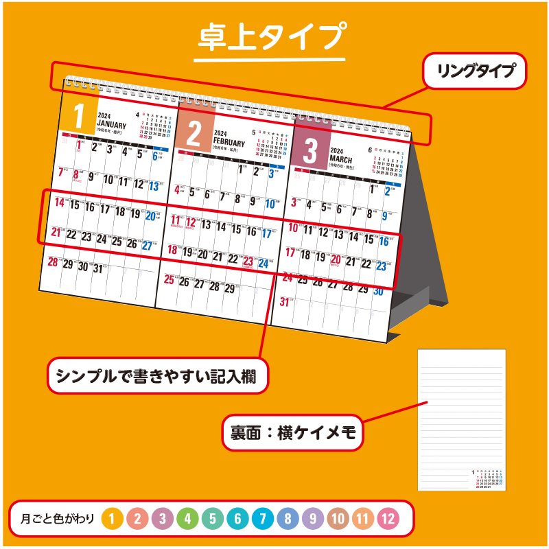 3ヵ月を一覧できるカラフルなカレンダー。長期のスケジュール管理に重宝します。2年分を一覧できる年間カレンダーが付いているので、長期計画の立案もしっかりサポートしてくれます。裏面が横ケイメモになっているので、ちょっとしたメモや備忘録としてご活用いただけます。